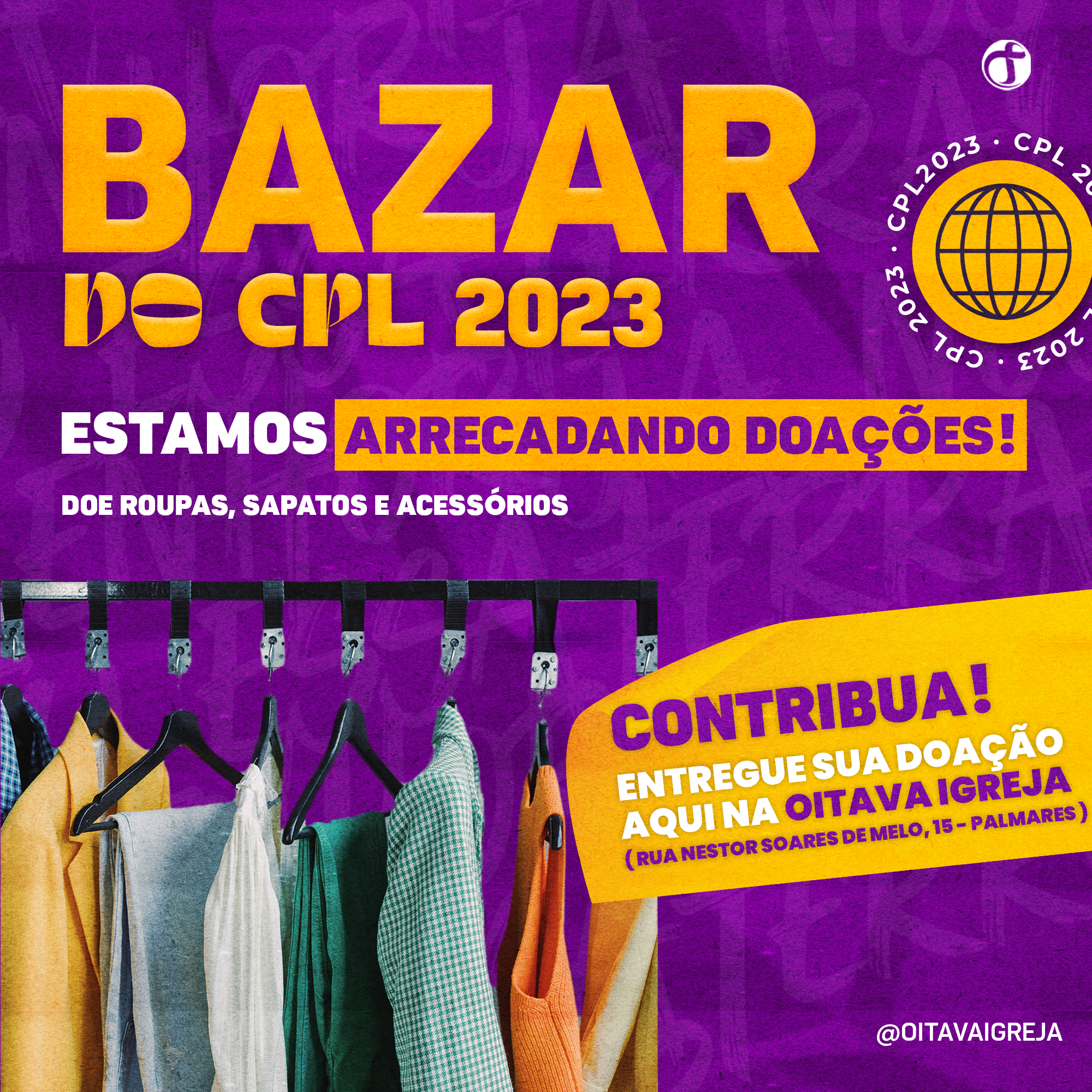 Sabe aquele par de sapatos que já não entra nos seus pés, ou aquela camiseta que não faz mais o seu estilo? Aqui na Oitava, eles têm serventia! Estamos arrecadando doações para o bazar do nosso Congresso de Pastores e Líderes, que será realizado no mês que vem, entre os dias 18 e 21, aqui em nossa sede. Você pode contribuir com: roupas, calçados, acessórios e brinquedos, desde que estejam em bom estado. Os itens devem ser entregues na portaria. Contribua e ajude-nos a fazer o CPL cada vez melhor!